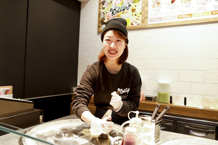- 入社後はオメガ湖南店でホールスタッフとして勤務しました。「ロールアイスの店舗を出すから、店長をやってみないか?」と言われたのは、1年半が経った時のこと。新しいことにチャレンジできるならと興味はありましたが、話をいただいた当初はお断りしました。ちょうどその頃、自分たちの世代が主力になる、代替わりの時期だったんです。「私が抜けると、他のスタッフに迷惑がかかるから残ります。」と当時の上司に伝えました。すると「人事のことは僕に任せてくれたらいい。