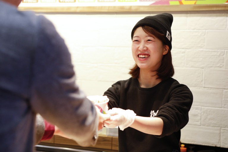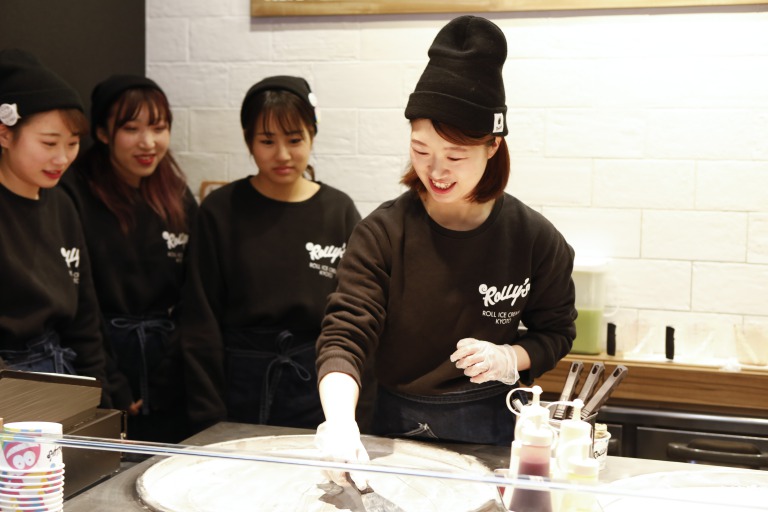 「接客」という意味ではパチンコと同じでしたが、アイスを自分で作って提供して、なおかつ店の運営も任されるロールアイスの仕事は、まったくの別物でした。最初の研修は、戸惑いの連続。先輩に助けてもらいながら、何度もアイスを作っては巻いて、作っては巻いて。発注や在庫管理、アルバイトさんとのコミュニケーションの取り方など、店舗経営の基本もその先輩に教えていただきました。大須に配属になってからも、わからないことは逐一電話でアドバイスをいただいて、できることを増やしました。おかげで少しずつ店長として働くのが好きになっていって。今では自分のお店のメンバーが、お客様から「すごい!」と褒めていただいている姿をみると、自分のこと以上に嬉しいと思えて、ロールアイスにきて良かったなと心から思っています。名古屋に来てから同期と会う機会は減りましたが、年に一度の社内イベントの際には全店が休みになるので、毎年必ず集まっています。会うとそれぞれに成長していて、刺激をもらえるのでこういう機会はすごくありがたいです。同期に負けないように早く一人前になって、2店舗・3店舗と任せてもらえるような店長を目指していきたいです。
