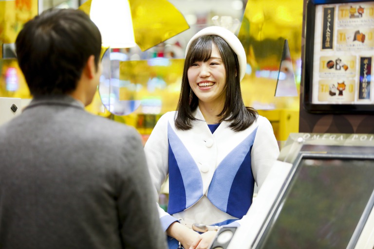 - こんなことを言うと怒られるかもしれませんが、私、一度もパチンコを打ったことがないんです(笑)。お客様が楽しむ様子を毎日見ながら、少しずつ知識を増やしています。最近のパチンコ台は、アニメや漫画とコラボしている台も多くて、私みたいなシロウトでも見てるだけで楽しめるんです。もともと少年漫画が好きだったこともあって、自然と興味がわいて、台や機械の仕組みなどもちょっとはわかるようになってきました。とはいっても、常連のお客様にはまだまだ知識はかないません。専門知識となるとこちらからお客様に質問させていただきながら、日々勉強させてもらっています。優しいお客様が多いので、面倒くさがらず、嬉しそうに教えてくださいます。だから、パチンコの知識がなくても、接客が好きなら楽しく働けるはずです。わからないことや困ったことがあったときは、先輩スタッフがすぐに相談に乗ってくれます。教え方も優しいですし、上に対してもはっきりと意見を言ってくださる先輩が多いので、どこの店舗に配属になっても、安心して働いていただけます。